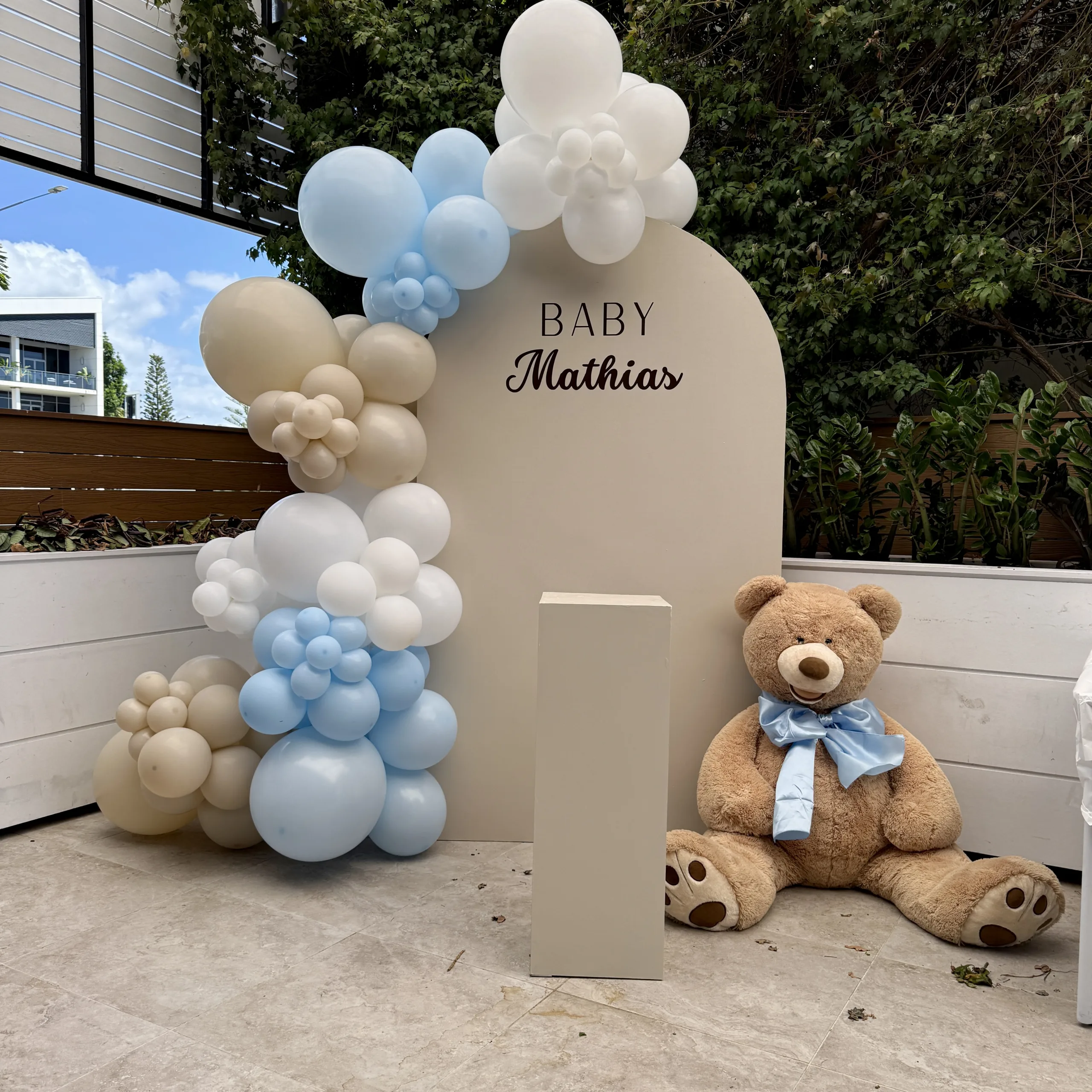 Includes – Arch Balloon | Garland Name Decal | Teddy Bear | Plinth